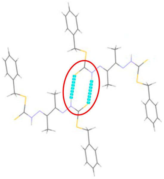 Break et al. (2023) [] reported macroacyclic dithiocarbazate Schiff bases (C20H22N4S4) and their corresponding Cu(II) complexes. Concerning organic ligands, bond lengths, bond angles, and torsion angles involving S atoms were mentioned, as was a comparison of the C–N and C=N (imine) bond distances. The dihedral angles of the planar moieties were assessed in the whole-molecule figures and text. The N–H···S hydrogen bonds linked the molecules to form R22(8) ring motifs (Figure 15). It should be noted that there are various topological methods for representing crystal structures and their elements. As regards the Cu(II) complex, coordination bond lengths and angles and the resulting metal and ligand rings were mentioned, with a focus on S atoms.