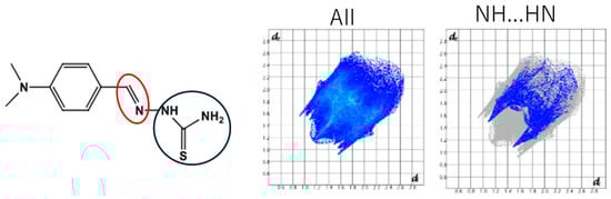 Ngoudjou et al. (2023) [] reported a Schiff base (n 2-(4-dimethylamino) benzylidene) hydrazine-1-carbothioamide) compound (C10H14N4S) for antioxidant studies. The overall centro-symmetric (due to the space group) V-shaped structure of its dimers, long C–S bond distance (thiol tautomeric form), comparable C–N bond distance (trans-configuration), and short C(phenyl)–C(keto) bond distance were mentioned. The results of the Hirshfeld surface analysis also revealed the presence of π···π stacking and N–H···π interactions (Figure 17). Hirshfeld surface analysis, which is presently important for describing intermolecular interactions, was explained at the beginning of this section briefly.