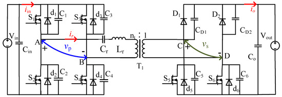 In the converter, each bridge leg consists of two switches controlled in complement with a 50% duty cycle and the necessary dead-band interval. The fixed switching frequency is set such that the high-frequency period T is . The primary side of converter can generate an HF square voltage between the midpoints A and B of each leg with an internal phase-shift . The secondary-side duty cycle refers to the high-level voltage () duration of with respect to the switching period T. The HF square voltage is generated between the midpoints C and D of each leg with PWM modulation. The phase shift is the resonant current zero-crossing point. The phase-shift refers to the ratio of the time between the rising edge of from zero to high level and the rising edge of from zero to high level. In addition, the ranges of the phase-shifts are ; hence, both and are quasi-square-wave HF voltages. Prior to performing detailed operational analysis, all assumptions regarding the switches, diodes, inductors, capacitors, and transformers are ideal. Optimizations were performed in the forward power mode (power flowing from to ). Optimizations for the reverse power mode (power flowing from to ) can be concluded following similar method.