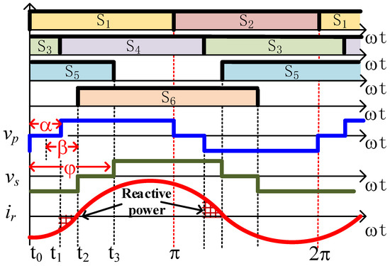 As highlighted by the red-colored area in Figure 2, the converter with two phase shifts may induce a duration of reactive power within each period during which the resonant current has polarity opposite to that of . Consequently, the RMS value of the resonant current becomes higher and the associated extra conduction loss leads to degraded efficiency. Therefore, our second optimization objective is to eliminate the reactive power through a phase-shift strategy. By checking the waveform in Figure 2, it is straightforward to align the rising edge (from 0 to positive) between and , which eliminates the reactive power duration twice in each period. On the basis of resonant current minimization, the condition of zero reactive power is presented in (15). The waveform without reactive power can be viewed in Figure 9.
