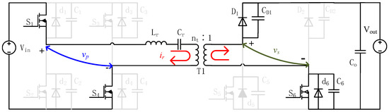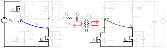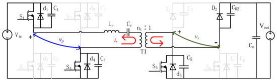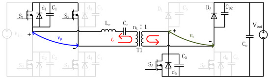 Interval 3 []: This interval begins with the resonant current reaching its zero-crossing point, as illustrated in Figure 5; changes polarity from negative to positive, during which the conduction route of the input side remains unchanged (). Due to the unidirectional conductivity of the diodes, the resonant current charges and discharges . Thus, diode begins to conduct, ensuring zero-voltage turn-on of switch . The secondary inverter voltage commutates to zero, as both and are conducting together. Electric energy is stored in the resonant tank during this interval.