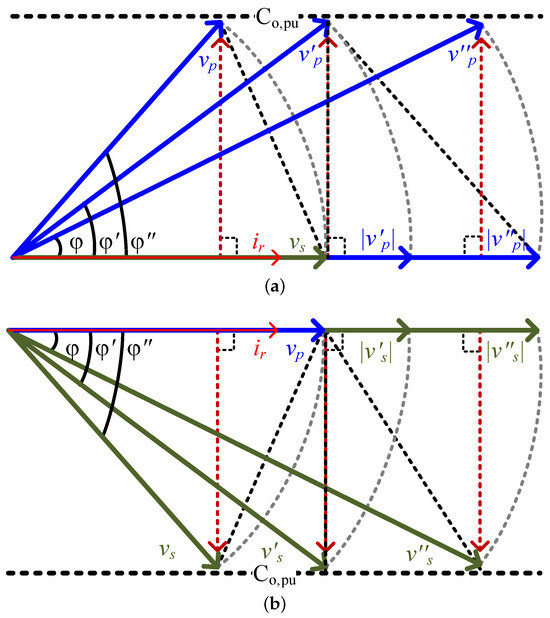 Equation (11) establishes a proportional relationship between the phase shift and HF transformer voltage . For analysis, it is assumed that the low-voltage side and transmission power remain constant. Hence, (11) in different converter gain cases can be illustrated by a phasor diagram, as shown in Figure 8.