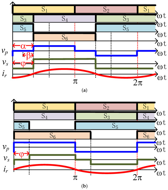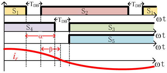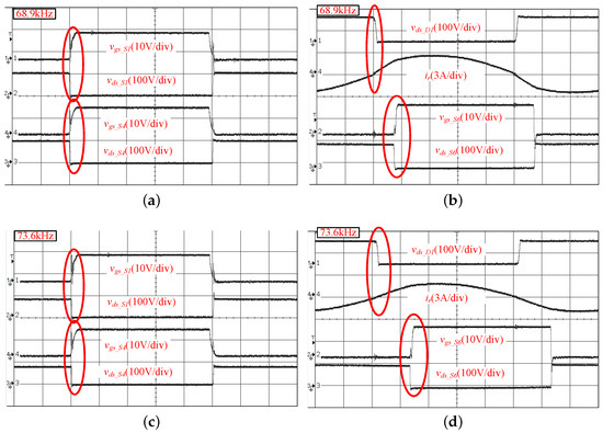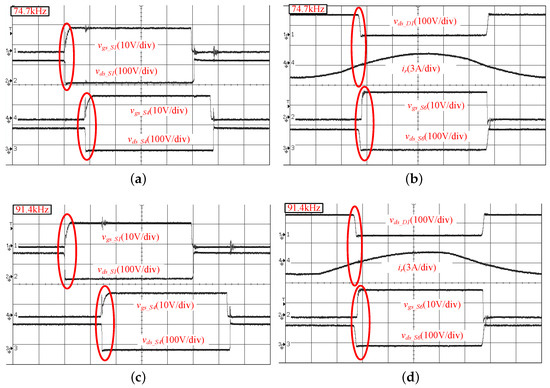 where and are the respective rise and fall times of the current and voltage of the MOSFETs on both sides. As Figure 10 shows, the sufficient conditions (boundary case conditions) of soft-switching operation with our proposed strategy are .