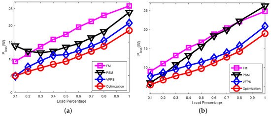 The total power loss obtained by solving (24) is compared with previous works that include FM, PSM, and variable-frequency phase-shift modulation. These comparisons are plotted in Figure 11 for buck mode and boost mode. It can be observed that our proposed hybrid optimization strategy consistently maintains the lowest total loss level across cases with different converter gain M. Both the proposed strategy and variable-frequency phase-shift modulation maintain soft-switching operation across the entire load range, implying that the switching loss has a dominant effect on the total power loss over a wide range of operating conditions. As expected, the proposed strategy effectively downgrades the current level, resulting in total losses that are lower than those in previous works. Meanwhile, the improvement becomes more apparent for medium and high load levels.