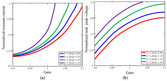 (a) Normalized resonant current with respect to the converter gain at different Q for and (b) normalized tank peak voltage with respect to the converter gain at different Q for .