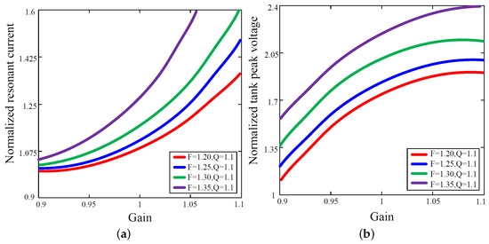 (a) Normalized resonant current with respect to the converter gain at different F for and (b) normalized tank peak voltage with respect to the converter gain at different F for .
