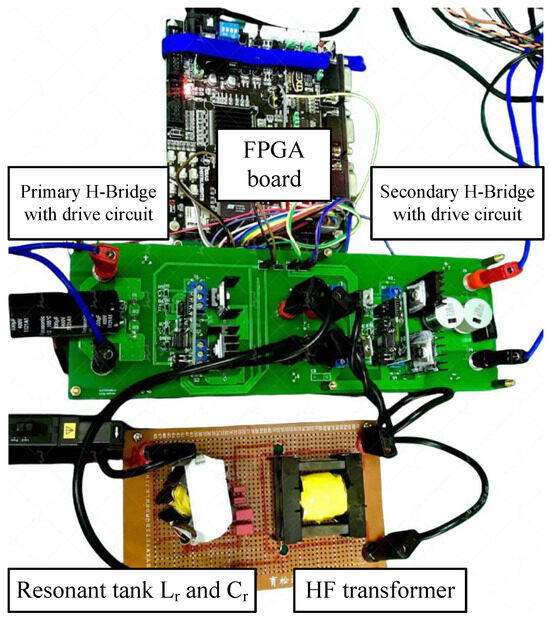 According to design procedure, a lab prototype of the Semi-SRDAB converter was built for validation. The experimental prototype converter layout was set up as shown in Figure 14. An EP4CE115F23I7N FPGA board from Altera was applied as the PWM generator to generate the gating signals of the converter. The switches on the H-bridge (–) were implemented with IPP320N20N (200 V, 34 A, = 32 m, nC at V) from Infineon. All the diodes on the secondary side utilized MBR40250 (250 V, = V). The resonant tank was composed with (67 H, martial: RM14) and (55 nF, martial: MKP). The HF transformer was made from an ETD49 ferrite core with a material type of N97. The actual turn ratio of the windings was 21:20 ( = 1.05:1) and the resulted magnetizing inductance was 3.75 mH. An EA 8360-15T bench power supply was used as the input DC source, and the load was a BK 8510 programmable DC electronic load. The details of the prototype implementation are listed in Table 2.