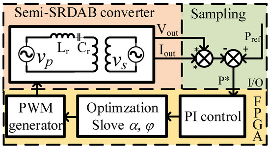 The closed-form control block diagram is depicted in Figure 15. The output voltage and output current are dynamically adjusted by a PI compensator which balances the input and output power. Concurrently, based on the PI results, the optimization is solved online to determine the phase shifts and . These optimal phase shifts are then fed to a PWM generator, which produces the appropriate gating signals for the Semi-SRDAB converter.