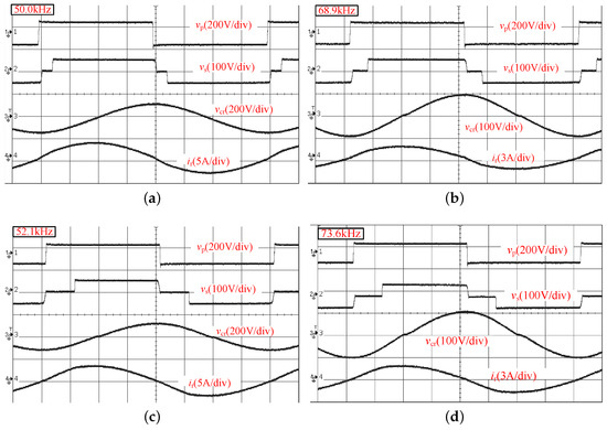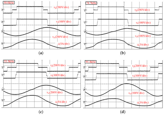The experimental waveforms in the optimized steady-state for different mode are depicted in Figure 16 and Figure 17. The prototype Semi-SRDAB converter was verified under optimization operations for different input voltages = 80 V, 90 V, 110 V, and 120 V, which correspond to voltage gains 1.25, 1.11, 0.91, and 0.83, respectively. For each input voltage , full load condition and 20% load condition were selected. Figure 16 illustrates the optimal steady-state experiment waveforms during buck mode operation and Figure 17 depict the same for boost mode operation. From top to bottom, the recorded waveforms are the input side voltage , output side voltage , resonant tank voltage , and resonant current . All waveforms match the predicted optimization discussed in last section. Thus, the reactive power and resonant current are successfully minimized and soft-switching operation is maintained over the whole load range. The measured operating waveforms (especially ) for different loads are similar, as they share the phase shifts and with the same converter gain M. The difference is that the switching frequency is the design point at full load, as opposed to leaps in the case of light loads.