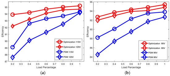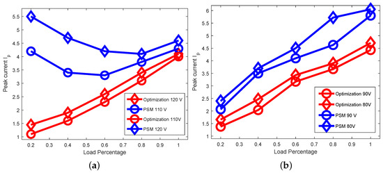 Figure 20 compares the experimental peak resonant currents for the proposed hybrid optimization strategy and conventional phase shift modulation for different input voltages. As expected, the apparent improvement brought about by the proposed modulation provides a lower peak resonant current, especially when the gain is far away from unity. This is apparent in both buck mode and boost mode. In buck mode, Figure 20a shows that with conventional PSM the current at first declines with the decrease in load level, then increases in the light load region. With the hybrid optimization strategy, the current deceases as the load level falls. In boost mode, Figure 20b shows that the current is always lower than the PSM with the hybrid optimization strategy.