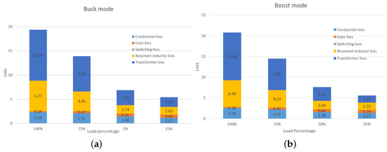 The measured total loss breakdowns for both buck mode and boost mode are shown in Figure 22. For simplicity, only the conduction loss, gate loss, switching loss, resonant core loss, and transformer loss were considered in the measurement tests. The conduction loss is caused by the loss from switches parasitic resistance, which is proportional to the resonant current. The resonant core loss and transformer loss are related to the windings, magnetic flux, switching frequency, core size, and materials. It can be clearly seen from the Figure 19 that the loss is mainly contributed by the transformer loss over the whole load range, while the changes in switching loss and gate loss are not significant. As an example, the detailed loss breakdown at V is illustrated in Table 4. Although there may admittedly be some measurement errors in the loss breakdown, these do not adversely affect the conclusion that the proposed converter optimization works efficiently.
