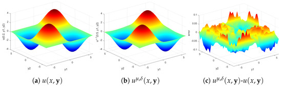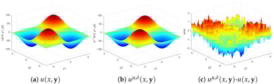 The results given in Table 4, Table 5 and Table 6 are similar to those of Table 1, Table 2 and Table 3; therefore, the a posteriori parameter choice strategy and the Gaussian kernel function are used next. When and , the exact solution , the regularization solution , and the error at , , and are given in Figure 4, Figure 5 and Figure 6, respectively. The results are similar to those of Example 1.
