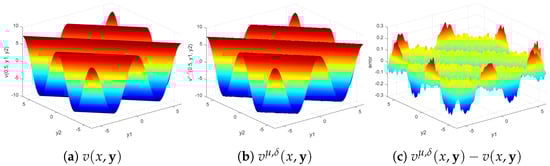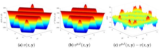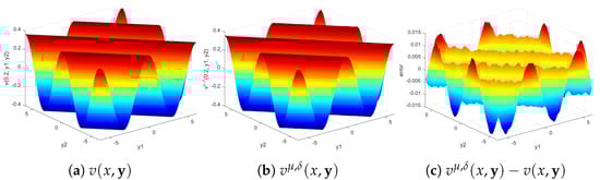 Therefore, the a posteriori parameter choice strategy and the Gaussian kernel function are used in the following experiments. When and , the exact solution , the regularization solution , and the error at , , and are given in Figure 1, Figure 2 and Figure 3, respectively. Figure 1, Figure 2 and Figure 3 show that the regularization solution can approximate the exact solution well, and the approximation effect of is better for smaller x.