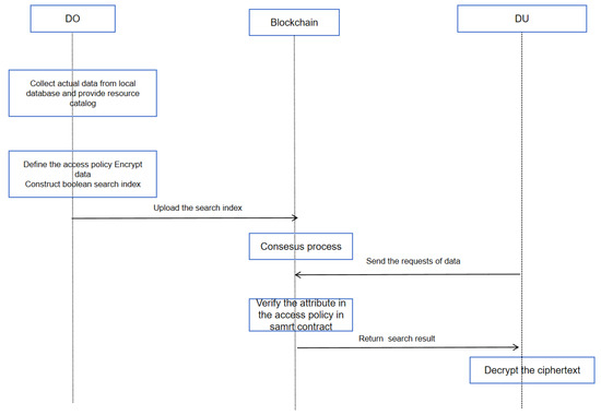 When DOs want to share data with DUs in the CPC system, they first collect actual data from the local database and provide a resource catalog. Then, DOs need to encrypt data via the CP-ABE algorithm and construct searchable indexes on the blockchain. DUs send the request to the blockchain with the attribute, the smart contract maps the attribute in the policy, DUs obtain the encrypted data, and then they choose the privacy computing algorithm that is recommended by the resource catalog. For instance, if DUs want to obtain the computed result, they need to obtain the computation model to finish computing via federated learning. DUs obtain encrypted data from DOs and obtain a private key to decrypt data. The specific data-sharing process is shown in Figure 2: