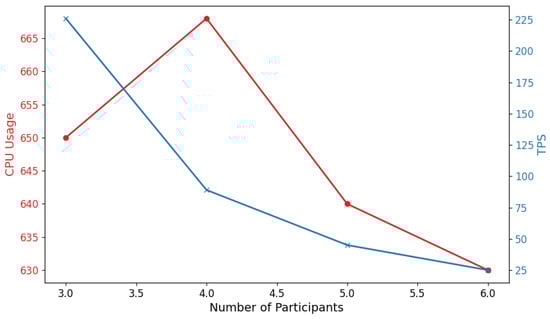 In order to assess the operational efficiency of the CPC system, we first conducted tests on the data-sharing time across different numbers of organizations. Specifically, we recorded the end-to-end data-sharing time when the number of organizations was two to six. The data-sharing time includes the time taken to provide data, calculate, and save the results. We implement the TPS and CPU usage in Figure 3. The data storage time and data query time are determined by the creation of a new blockchain through ChainMaker. Therefore, we present the computation times for scenarios involving two parties and three parties in Table 3 and Table 4. The results demonstrate that the CPC system completes data sharing securely and accurately.