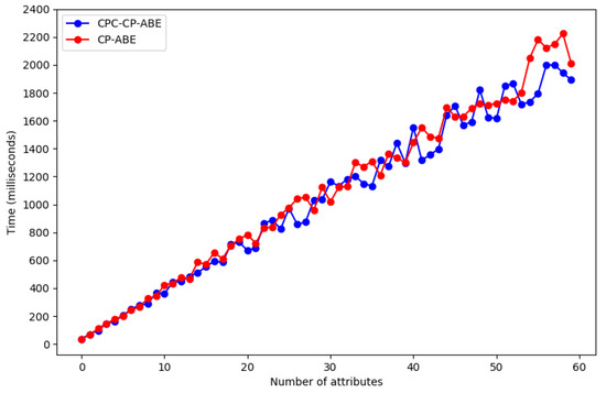Then, we evaluated the efficiency of attribute-based encryption. We compared the performance of the CPC system on a smart contract to that of the CP-ABE tool on bare metal. Consistent with theoretical expectations, the time for generating attribute keys increases with the number of user attributes. We demonstrated the feasibility of CP-ABE running time in the CPC system from Figure 4. We show encryption time and decryption time in Figure 5.