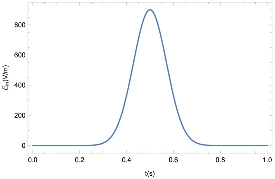 In the following, we perform a simple, but real in terms of physical content, calculation to go through the individual steps of the solution. Despite the great simplification, the obtained results are realistic. When the electromagnetic wave arrives at the surface of the conductor, the wave begins to be absorbed precisely because of the electrical conduction. When the electromagnetic wave arrives at the surface of the conductor, the wave begins to be absorbed precisely because of the electrical conduction. We can describe this process by Equations (24) and (25) or (28) and (29). Let us assume that an electric wave of amplitude of arrives at the conductor’s surface. The time evolution of the incoming Gaussian electric field strength is