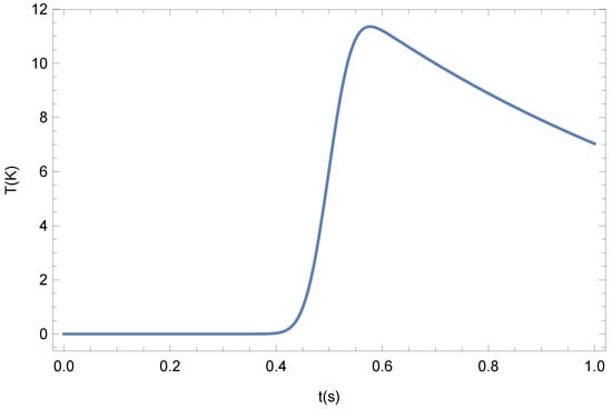 The absorbed electromagnetic energy is transformed into the energy of phonons, which manifests itself as a temperature increase in the bulk. The model cannot currently tell in which distribution the individual phonon energies appear. We take the phonon wave number as 1/m, and we assume that this is the wave number for all phonons. Solving Equation (76), we obtain the time dependence of the surface temperature. We can see its graph in Figure 2.