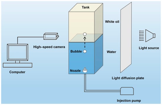 The layout of the entire experimental system is shown in Figure 1. The rectangular tank was made of a high-definition acrylic plate with dimensions of 150 mm × 150 mm × 400 mm, and two liquid media—deionized water and different types of industrial white oil—were used for the experiment. The viscosities, surface tension coefficients, and interfacial tension coefficients of the different liquids were measured using a viscometer and a surface tension meter, and their physical parameters at 21 °C are shown in Table 1. The interfacial tension between water and white oil was 0.0376 N/m, and interfacial tension largely determines bubbles’ state near the liquid–liquid interface [40]. The tank size was large enough relative to the bubbles to eliminate the effect of the tank walls on the bubbles. The adjustable air volume of the single-channel air pump and parallel nozzles fixed at the bottom of the tank periodically generated bubbles. During the experiment, by adjusting the flow rate of the air pump, we ensured that the wake of bubbles would not affect the movement of subsequent bubbles. The initial bubble size could be adjusted by replacing the nozzle with others of different diameters.