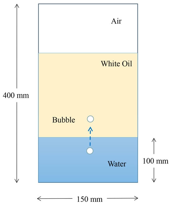 In this study, the fluent VOF multiphase flow model was mainly used to calculate the behavior of bubbles with different initial diameters when they crossed the oil–water interface and the bubble motion path. To this end, a high-speed camera was used to collect instantaneous bubble images, and the focus of this study was on the formation and shedding of the liquid film on the bubble surface at the oil–water interface, not on the three-dimensional path of the bubble movement. Corresponding to the bubble experiments (where the bubbles were photographed from the front), the axisymmetric physical model was simplified to a two-dimensional rectangular computational domain. There are some differences between using 2D simulations compared to 3D simulations, but these differences have little effect on the analysis of the final results, which can be approximated as a cross-section of the 3D results. Therefore, the physical model was simplified to a two-dimensional rectangular computational domain with a size of 150 mm × 400 mm, as shown in Figure 2. In our study, the origin of the coordinate system was chosen to be the lower left corner of Figure 2. The initial bubble was placed at the bottom of the computational flow field, its upward behavior driven by buoyancy, and the liquid was initially assumed to be at rest during the simulation. The sides and bottom of the computational domain were set to no-slip wall boundary conditions, the top was set as a pressure outlet with water return only, and the effect of gravity was considered throughout the simulation.