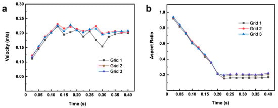 where dv is the vertical projection length of the bubble, and dh is the horizontal projection length of the bubble. The calculation results of the three grids are shown in Figure 3. For the bubble rise rate, the results of the calculations for grid 3 and 2 were almost identical in general terms. The results of grids 1 and 2 showed a deviation between 0.15 s and 0.3 s, and the deviation reached its maximum at 0.275 s. The results of grids 1 and 2 showed the largest deviation, which was between 0.25 s and 0.3 s. For the aspect ratio of the bubbles, the three groups of grids were almost the same before 0.2 s. After 0.2 s, the calculations for grid 1 were significantly lower than the other two sets of grids, and the calculations for grids 2 and 3 were much closer. The total number for grid 1 was 176,589, for grid 2, it was 256,356, and, for grid 3, it was 395,664. After combining the calculation results of the bubbles’ rising velocity and aspect ratio for the three grids, to reduce the calculation cost, grid 2 was finally selected. The time step was set to 1.0 × 10−5 s, and the residual of velocity and continuity less than 1.0 × 10−5 was considered convergence.