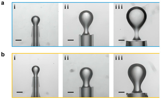 Instantaneous pattern of air bubbles exiting nozzles of different sizes—(i) 2 mm nozzle; (ii) 4 mm nozzle; and (iii) 6 mm nozzle—and coming into contact with (a) water and (b) white oil. Scale bar, 2 mm.