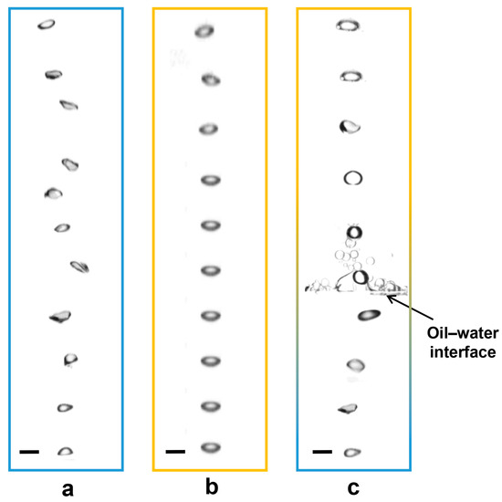 As shown in Figure 5c, the rising trajectories of the bubbles in the system composed of two mutually incompatible liquids behaved differently in the regions above and below the liquid–liquid interface. The rising trajectories of bubbles below the interface and the changes in bubble morphology were similar to those observed in water. As the bubbles approached the oil–water interface, the force state acting on the bubble changed, resulting in a shape and a trajectory which were significantly different from those seen in water. When the bubbles crossed the oil–water interface, the denser liquid attached itself to the surface of the bubbles in the form of a thin, liquid film. As the bubbles continued to rise, a small portion of the water wrapped around their surface began to fall, and the remaining water wrapped the bubbles completely, forming a closed liquid film, the constraint of which caused the bubbles to appear as approximate spheres.