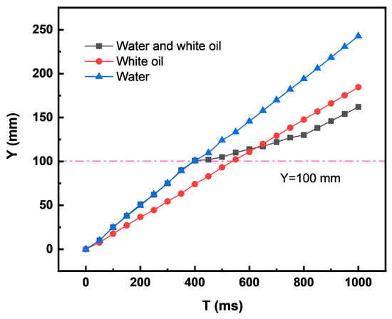 Taking the instant of bubble detachment from the nozzle as the initial moment, Figure 6 shows the correspondence between the vertical height of a 2 mm diameter bubble and the time, providing a reference for determining the time span required for the bubble to reach different stages of its movement towards the surface. The three lines in the graph correspond to the three cases shown in Figure 5. For the bubbles in water or white oil alone, the slope of the curve does not change much throughout the process. The viscosity of white oil is greater than that of water, so the rise of bubbles in white oil is relatively slow. The height of the oil–water interface is 100 mm, and, in the case of the coexistence of the two liquids, the bubbles have to overcome interface resistance when passing through the oil–water interface, which leads to a slower rising speed and an increase in the time span taken passing through the interface. When the water film on the surface of the bubble is completely detached, resulting in an increase in the bubble’s rising rate, the slope of the curve is almost the same as in white oil.