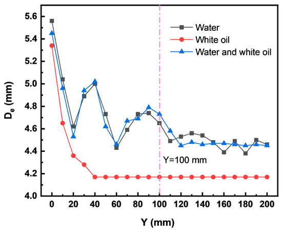 The comparison of the rising behavior of 4mm bubbles with equivalent diameter and vertical height in water, white oil, and water and white oil is shown in Figure 7. The height of the oil–water interface is 100 mm. The shape of the bubbles changed during their upward movement, and the diameter of the bubbles fluctuated with their relative height. In water alone, the shape of the bubbles varied during their climb, so the equivalent diameter fluctuated considerably. In white oil alone, the shape of the bubble remained essentially unchanged after leaving the nozzle, and the equivalent diameter of the bubble rapidly decreased to a stable value. In the case of the coexistence of two immiscible liquids, the variation profile of bubbles with equivalent diameters was approximately the same as that seen in water alone prior to the bubbles making contact with the oil–water interface. As the bubbles gradually crossed the oil–water interface, the oil–water interface tension exerted a drag on the bubbles, decreasing the magnitude of fluctuations in the diameter of equivalent bubbles. Subsequently, the water film began to collapse and gradually fall off, and, when the bubbles were completely detached from the water film, the diameters of equivalent bubbles fluctuated slightly and then converged to a stable value. The comparison showed that the final diameter of equivalent bubbles under the coexistence of oil and water liquids was larger than in the case of white oil.