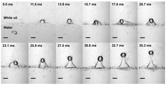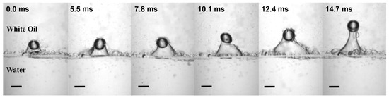 Figure 12 shows the liquid film change process of a 4 mm diameter bubble at the oil–water interface under the high-speed visualization experiment of bubble flow. When the bubble crosses the oil–water interface, the bubble is spherical in shape and pushes up the water film. With the increase in time, the blank area between the water film and the bubble gradually increases and is axisymmetric with respect to the bubble’s centerline. Compared to the 2 mm bubbles, the biggest difference is that the blank area between the water film and the bubbles does not appear asymmetric, and there is no tendency for the bubble movement path to be deflected, and the bubbles rise in a nearly straight line. When the bubbles continue to move upward, the water film changes, similarly to the 2 mm bubble, and the neck of the water film gradually becomes narrower. In addition, the initial size of the bubbles generated by the 4 mm diameter nozzle is larger, and the water film entrapment capacity is stronger. Comparing Figure 12 and Figure 11, it can be seen that the volume of water entrained by the 4 mm diameter bubbles is larger, and the upward raised umbrella area of the oil–water interface is larger.