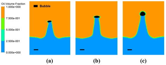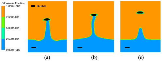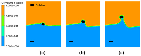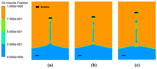 Numerical simulation of the liquid film change process of a 2 mm bubble at the oil–water interface: (a) t = 14 ms; (b) t = 23 ms; and (c) t = 27 ms. Scale bar, 2 mm.