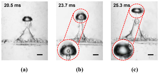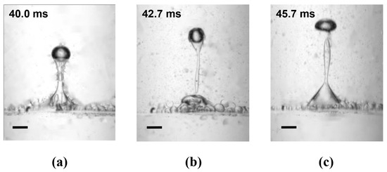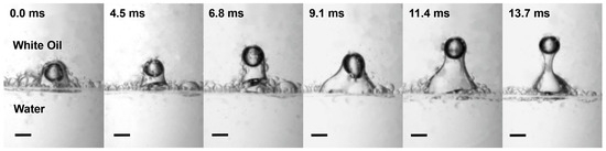 - Li, E.Q.; Al-Otaibi, S.A.; Vakarelski, I.U.; Thoroddsen, S.T. Satellite formation during bubble transition through an interface between immiscible liquids. J. Fluid Mech. 2014, 744, R1. [Google Scholar] [CrossRef]