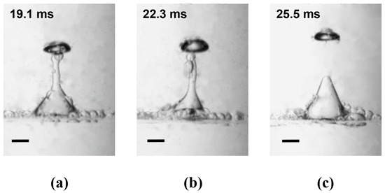 Numerical simulation of the collapse process of the water column below a 4 mm bubble: (a) t = 20 ms; (b) t = 24 ms; and (c) t = 28 ms. Scale bar, 4 mm.