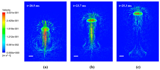 Numerical simulation velocity vector of the surrounding flow field during the rise of a 4 mm diameter bubble: (a) t = 20.5 ms; (b) t = 23.7 ms; and (c) t = 25.3 ms. Scale bar, 2 mm.