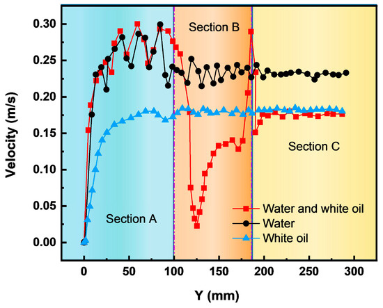 We selected a 4 mm diameter bubble to analyze its movement speed in different liquid phases. As shown in Figure 19, the instantaneous position of the bubble was determined by high-speed visualization experiments, and the longitudinal rise velocity of the 4 mm diameter bubble was plotted as a function of the longitudinal coordinate. The change in the velocity of the bubble motion depended on the change in the overall force applied on the bubble, and the slope of the velocity curve indicated the change in the acceleration of the bubble. The experimental results show that, in water, the rising velocity of the bubble first increases after it is detached from the nozzle, and the velocity curve begins to fluctuate up and down after a height of 25 mm. The main reason for the velocity fluctuations is the frequent changes in the overall force applied on the bubble and the breaking of the symmetry of the wake. The liquid at the top of the bubble is in a relatively static state when no bubbles are passing through it, and the liquid at the bottom instantly creates a void and pressure difference in the area where the bubbles are passing through due to the rise of said bubbles. The surrounding liquid fills these voids, causing a large disturbance in the flow field which affects the bubble rising rate. When the height of the vertical coordinate exceeds 200 mm, the bubble rising rate stabilizes. In contrast, in white oil alone, the velocity of the bubbles increases rapidly after detaching from the nozzle, and the bubble velocity stabilizes when the height of the longitudinal coordinate exceeds 100 mm. The bubble stabilization velocities in only water and only white oil were about 0.22 and 0.18 m/s, respectively, and it is clear that the difference in liquid viscosity was the main influencing factor for the difference in bubble stabilization velocities.