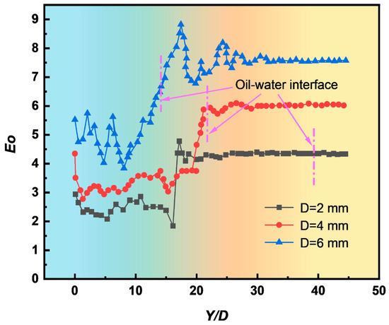 The location of the oil–water interface is labeled in the figure, and when the bubbles traverse the oil–water interface, the bubble shape and surface tension change drastically, resulting in significant fluctuations in Eo. When D = 2 mm and D = 4 mm, the Eo number essentially remains stable after the bubble crosses the oil–water interface. Finally, a stable shape is reached in the case of D = 6 mm, and, after the bubble crosses the oil–water interface, the Eo number keeps fluctuating over a long distance, eventually stabilizing. The trend of the Eo number is consistent with the transient behaviors of the bubbles depicted in Figure 8, Figure 12 and Figure 15.
