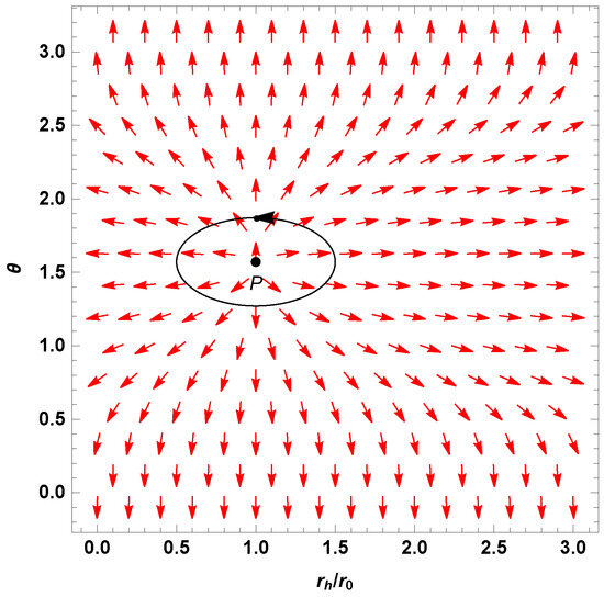 We take and with being an arbitrary positive constant, so there is one zero point in the plane at . We plot the unit vector field in Figure 1. The loop surrounding the zero point sets the boundary of a given region, so we can use Equation (24) to acquire the winding number of point P. We find that . As discussed in [7], the cosmological constant is considered a dynamical variable in the extended phase space, which is interpreted as the pressure . So, for the fixed value of p or , we can calculate the heat capacity at constant pressure through