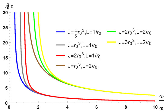 Once the values of L and J are fixed, we could acquire a curve in the plane. We depict the curve in Figure 2. Higher values of J and L result in higher for a given . So, when the cosmological constant gets larger, L becomes smaller, giving a smaller for a given value of . As J increases, the curves indicate an increase in for a given . Each curve descends steeply at small values and then flattens as increases, indicating that stabilizes with larger horizon radii. When taking and , the curve monotonically decreases as increases. Consequently, the vector field possesses one zero point for a given , which is exactly the same as the non-rotating case. When , the zero point is at , and we find that the winding number is also 1, so the topological charge of the rotating solution is 1. The result is quite different from higher dimensional cases, in which rotation brings changes to global topological numbers [12].