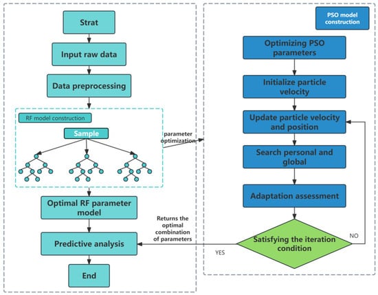 The PSO algorithm exhibits distinct advantages compared to other optimization algorithms utilized in RF model applications. It has a simple structure, is easy to implement, and possesses powerful global search capabilities. The algorithm effectively avoids local optimal solutions, is adaptable, and can manage nonlinear and complex objective functions. Furthermore, PSO generally demonstrates a faster convergence speed, enhancing the algorithm’s efficiency, and exhibits high flexibility, allowing it to be integrated with various models and optimization tasks. This method excels particularly in optimizing the two parameters, m and d, within the RF model, thereby improving both the prediction accuracy and the robustness of the model.