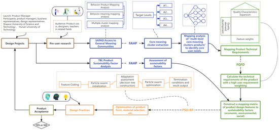 In this study, the “behavior–product” and “behavior–meaning” mapping analysis was conducted using the SAPAD framework, resulting in the identification of general meaning clusters across four levels. Next, these clusters were analyzed, and identical core meaning clusters were merged to determine the primary needs of users. Subsequently, the user requirements were weighted using fuzzy hierarchical analysis (FAHP), and the weight values were calculated. This was followed by the analysis and mapping of the core user requirements through the application of fuzzy quality function development (FQFD), resulting in specific product technical requirements. Immediately thereafter, the triple bottom line (TBL) method was applied to assess the product sustainability factors; construct a hierarchical model representing the economic, social, and environmental sustainability factors; and quantify them to ascertain which factors exert the most significant influence on the product’s sustainability. A mapping matrix was then constructed to correlate the product’s technical requirements with the sustainability factors identified through the TBL analysis. Furthermore, the particle swarm optimization (PSO) and random forest (RF) methods were utilized to predict the design sustainability aspects related to the product form and materials, ensuring that the foundational sustainability benchmarks were achieved while also addressing the core user needs. Through this rigorous analysis and optimization process, a smart charging pile was ultimately designed to fulfill the user requirements while achieving a high degree of sustainability, thereby adhering to the principles of modern sustainable development. The design flowchart is illustrated in