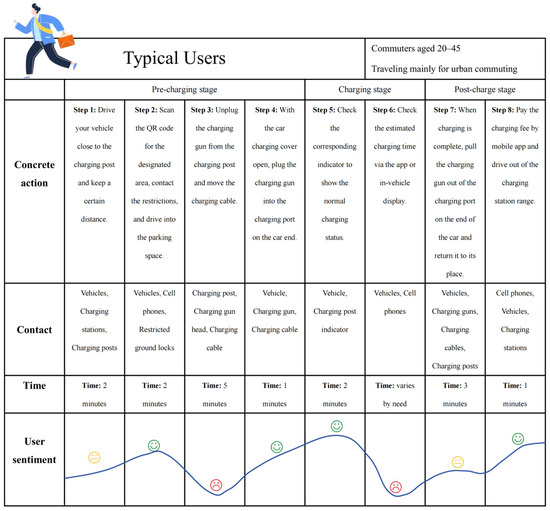 Firstly, a study was conducted on the user behavior regarding charging posts in a business office area in Changsha, China, and two research methods, non-participatory observation and in-depth interviews, were used to obtain practical feedback from 26 owners. After sorting and summarizing the vital behavioral touchpoints in this information, a representative user charging behavior path diagram was established, as shown in