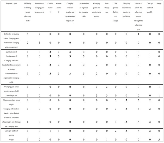 Subsequently, the meaning points of the semantic, constructive, experiential, and pragmatic layers were selected to initiate the cluster analysis. Scores were assigned using the expert method, where values of 3, 2, 1, and 0 were utilized to represent the strength of meaning relevance. Specifically, a score of 2 denotes stronger relevance, while a score of 3 indicates the strongest relevance. The semantic layer reflects the user’s feelings about the product, and the cluster analysis yielded five general meaning clusters related to the semantic layer: ① issues with the layout of the charging pile; ② the charging cables are prone to tangling; ③ the convenience of the charging gun is lacking; ④ the absence of a feedback functionality in the charging pile; and ⑤ the experience is more enjoyable and pleasurable. The results of the cluster analysis for the semantic layer are illustrated in