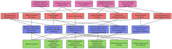 For instance, “effective cable storage” in the discourse structure layer, “wasting time using a charging post with tangled cables” in the experience layer, “charging cables are prone to tangling” in the semantic layer, and “effective cable storage” in the pragmatic layer exhibit strong correlations and similarities due to the shared demand for effective charging. Therefore, the general meaning clusters from the discourse structure layer, experience layer, semantic layer, and pragmatic layer were reanalyzed through cluster analysis to correlate and merge similar clusters. The similar general meaning clusters were associated and merged, as illustrated in