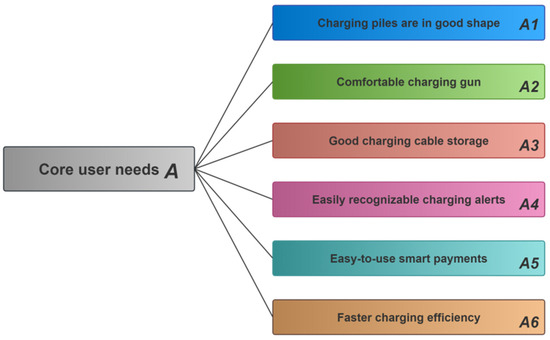 43]. The user’s charging experience serves as the target layer, while the user requirements are established as the criterion layer, thereby creating a hierarchical analysis structure, as illustrated in