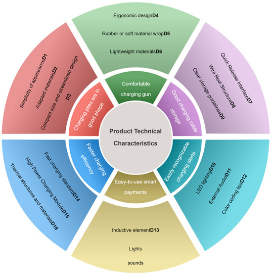 According to the corresponding six core user requirements, expanded to D1-D16, a total of 16 product design features were identified (easy to recognize and easy to operate regarding the same product technical characteristics). These included ① a good charging post shape and simple appearance (D1), a stable structure (D2), and a compact design (D3); ② a comfortable charging gun in the form of an ergonomic design (D4), rubber or soft material wrapping (D5), and a lightweight material (D6); ③ good charging cable storage with a quick-release connector (D7), a cable reeling device (D8), and clear storage guidelines (D9); ④ clear charging reminders in the form of LED lights (D10), sound (D11), and color-coded reminders (D12); ⑤ easy-to-operate smart payment in the form of sensing elements (D13), LED lights, and sound; and ⑥ faster charging efficiency in the form of fast charging standards (D14), a high-power charging module (D15), and a heat dissipation structure and material (D16).