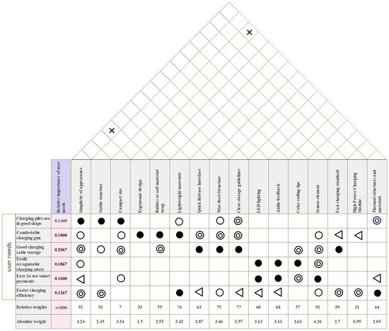 After the construction of the house of quality for the smart charging pile is completed, domain experts were invited to evaluate the correlation between the user needs and product design features, enabling the calculation of both absolute and relative weights for the design features of the smart charging pile. Finally, based on the house of quality for the smart charging pile—see