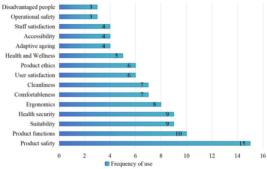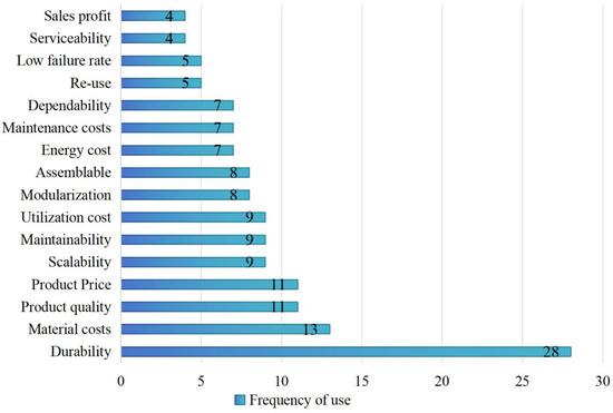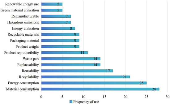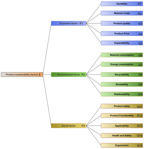 Table 8, the top ten essential factors among the fifteen sustainability factors are selected as the basis for the assessment of the core sustainability factors related to the economic, environmental, and social aspects of the product. The economic factors include product quality (G3), durability (G1), and the material cost (G2). The environmental factors consist of material consumption (G6), energy consumption (G7), recyclability (G8), reusability (G9), and replaceability (G10). The social factors encompass suitability (G13) and health and safety (G14).