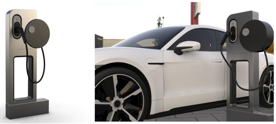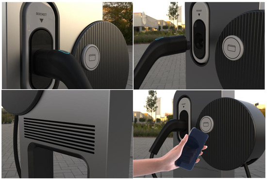 Comfortable touch design. Moving away the traditional image of the existing charging pile, the proposed device adopts an aluminum alloy outer frame, high-strength PC and ABS materials, a geometrical design for the body, and a streamlined design for the handle. The primary color is silver–gray; this hue is both stable and modern connotations. We thoroughly consider the height of the charging pile, the force point of the charging gun, etc., to reflect the use of the site area and users’ convenience.