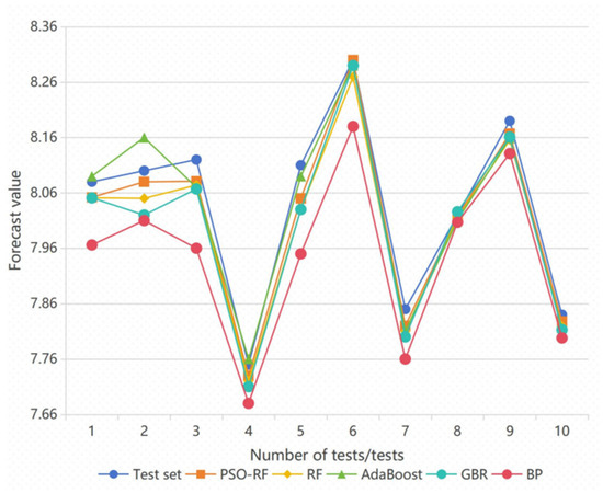 Figure 21, it can be observed that the fitting accuracies of each model are ranked as follows: PSO-RF model, RF model, GBR model, AdaBoost model, and BP neural network model, in descending order. Meanwhile, combining the RMSE and R