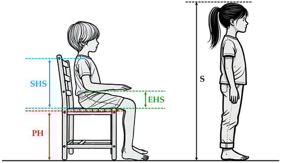 The height, popliteal height, elbow height, and shoulder height were measured for this study. Anthropometric measurements followed the procedures established in previous, similar studies [9]. Students were assessed on the right side (except for height) while seated in an adjustable chair with a horizontal seat surface. The legs were kept at a 90º angle, with the feet fully resting on an adjustable footrest. During the measurement process, the students were barefoot and wore shorts and a short-sleeved shirt. A 60 cm Cescorf anthropometer, certified by the International Society for the Advancement of Kinanthropometry (ISAK), was used for all measurements, with the exception of the height, which was recorded with a portable Seca stadiometer (range 20–205 cm). Measurements were conducted over ten sessions, one for each grade level evaluated, and recorded in centimeters by an assistant; all were carried out by the same anthropometrist. This approach minimized the errors that can occur when multiple anthropometrists are involved [20]. The precision and repeatability of the measurements were ensured by the anthropometrist’s training, certified at ISAK Level 3, and their prior experience in such evaluations. At least two measurements were taken for each parameter, and, if the difference exceeded 0.5 cm, a third measurement was taken. The following anthropometric measures were included to calculate the ideal furniture dimensions [21] (see Figure 1).